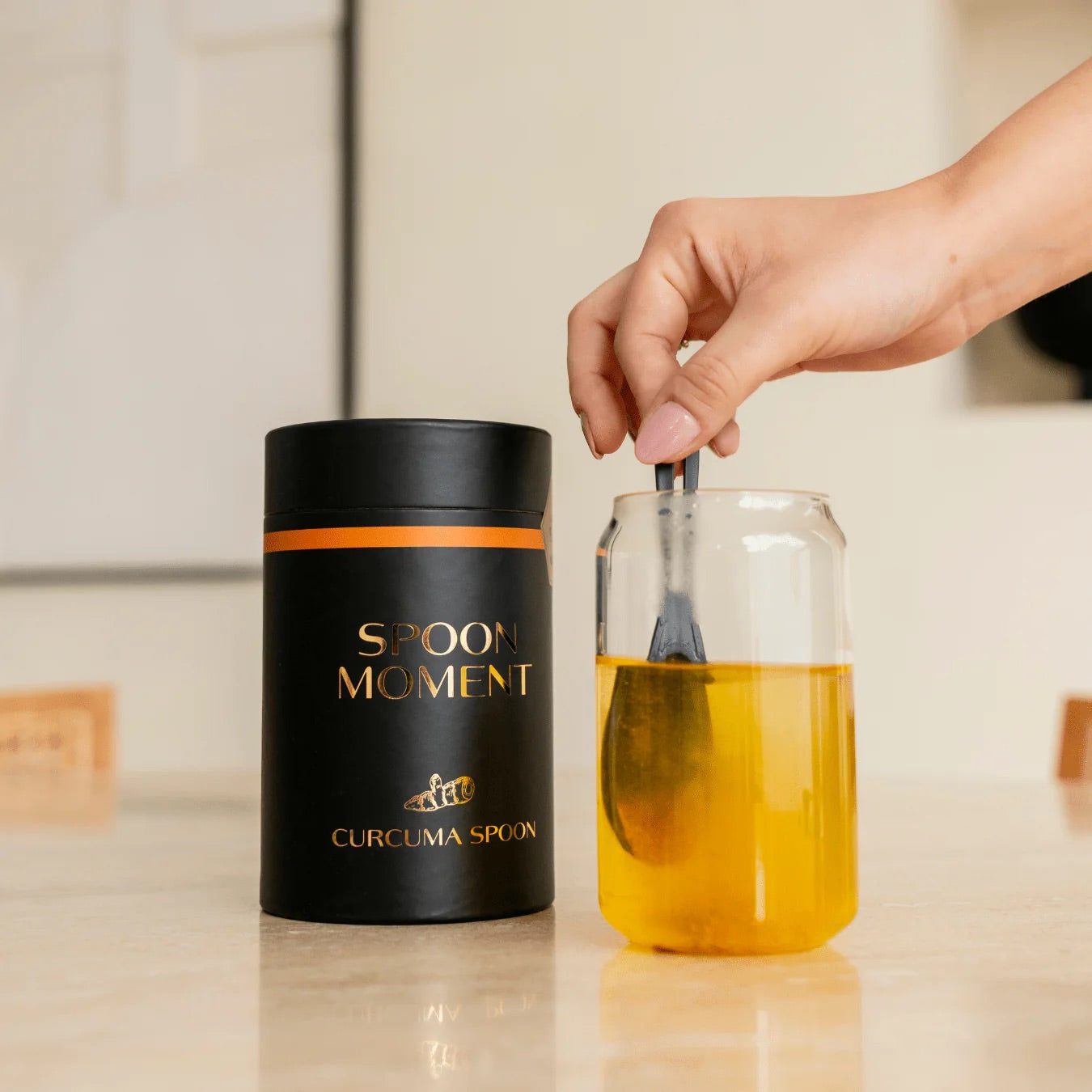 Theelepel gevuld met puur kurkuma-extract gemengd met 100% natuurlijke Turkse dennenhoning. Roer de spoon door een warme drank en geniet van jouw Spoon Moment!